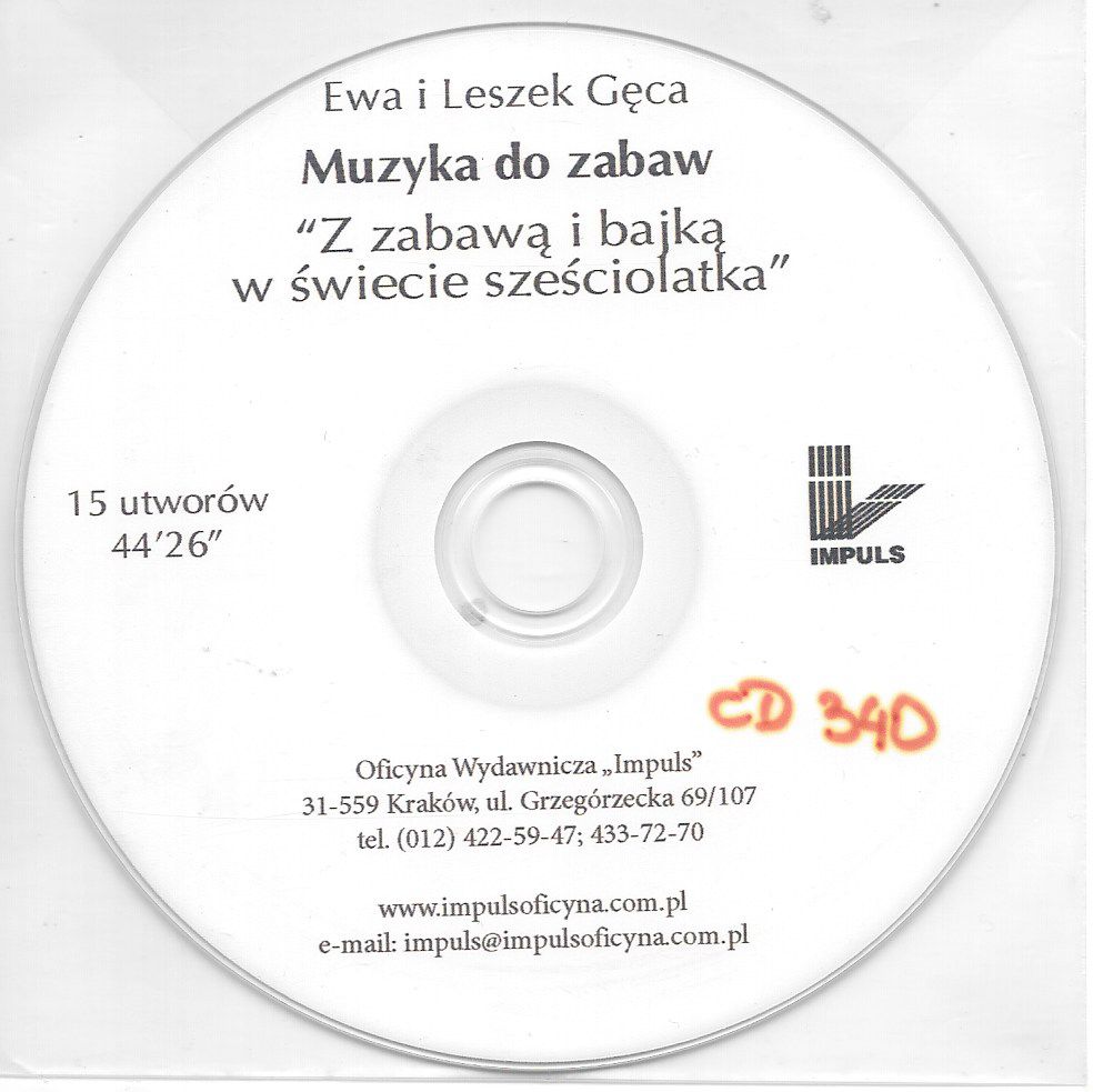 Muzyka do zabaw : z muzyką i bajką w świecie sześciolatka / Ewa Gęca, Leszek Gęca. - Kraków : "Impuls", 2005. - 1 dysk optyczny (CD) (44:26) : digital, stereo ; 12 cm.