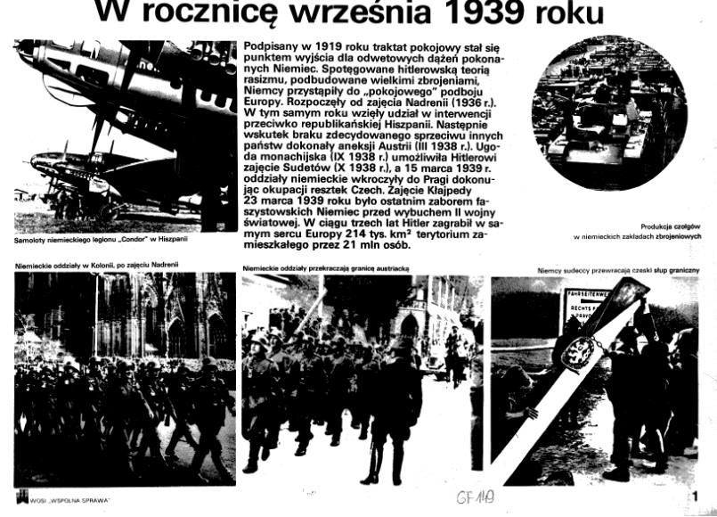 Teczka zawiera 20 plansz fotograficznych przedstawiających m.in.: siły armii polskiej i niemieckiej, obronę Warszawy i Wybrzeża w 1939 roku, ostanie walki, straty poniesione przez Polskę w II wojnie światowej.