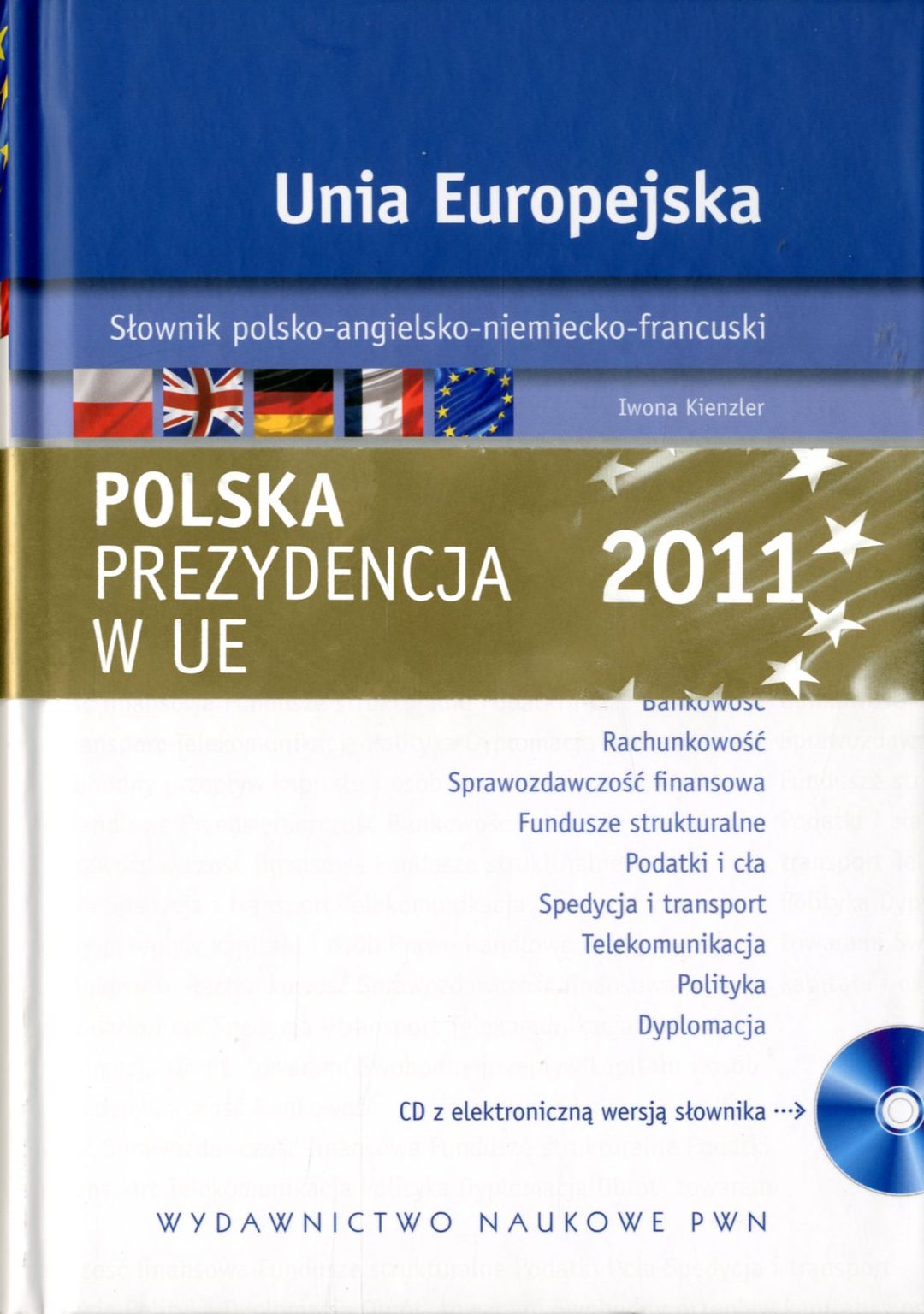 Unia Europejska : słownik polsko-angielsko-niemiecko-francuski / Iwona Kienzler. - Warszawa : Wydaw. Naukowe PWN, 2011. - 240, [4] s. ; 21 cm + 1 dysk optyczny (CD-ROM).