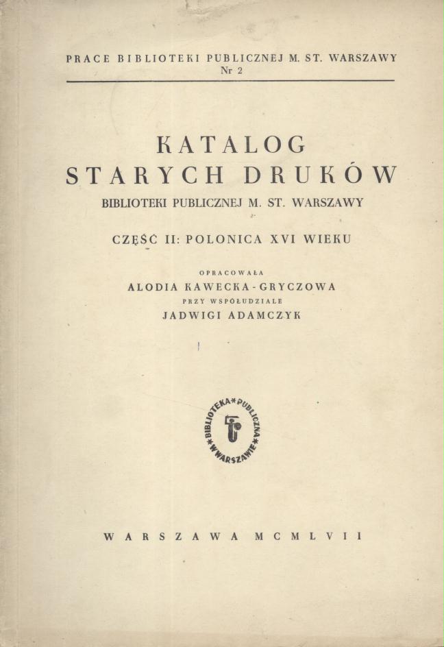 K. tyt. również w jęz. fr., tyt. : Catalogue des imprimés anciens de la Bibliotheque Publique de Varsovie.