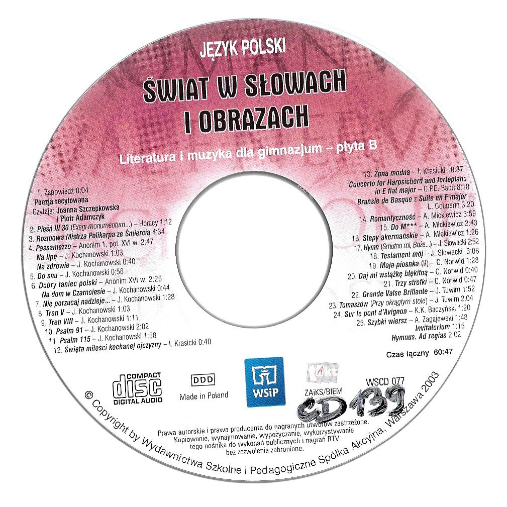 Płyta B zawiera: 1. Poezja recytowana, czytają: Joanna Szczepkowska, i Piotr Adamczyk: Pieśń III 30 (Exegi monumentum...) / Horacy. Rozmowa Mistrza Polikarpa ze Śmiercią. Passamezzo / Anonim. Na lipę ; Na zdrowie ; Do snu ; na dom w Czarnolesie ; Nie porzucaj nadzieje... ; Tren V ; Tren VIII ; Psalm 91 / J. Kochanowski. Dobry taniec polski / Anonim. Rex / Anonim. Święta miłości kochanej ojczyzny ; Żona modna / I. Krasicki. Concerto for Harpsichord and Fortepiano in E flat major / C. P. E. Bach. Bransle de Basque z Suite en F Major / L. Couperin. Romantyczność ; Do M ; Stepy akermańskie / A. Mickiewicz. Hymn (Smutno mi, Boże...) ; Testament mój / J. Słowacki. Moja piosnka (II) ; Daj mi wstążkę błękitną ; Trzy strofki / C. Norwid. Grande Valse Brillante ; Przy okrągłym stole / J. Tuwim. Sur le pont d'Avignon / K. K. Baczyński. Szybki wiersz / A. Zagajewski. Invitatorium (fragm.). Hymnus. Ad regias.