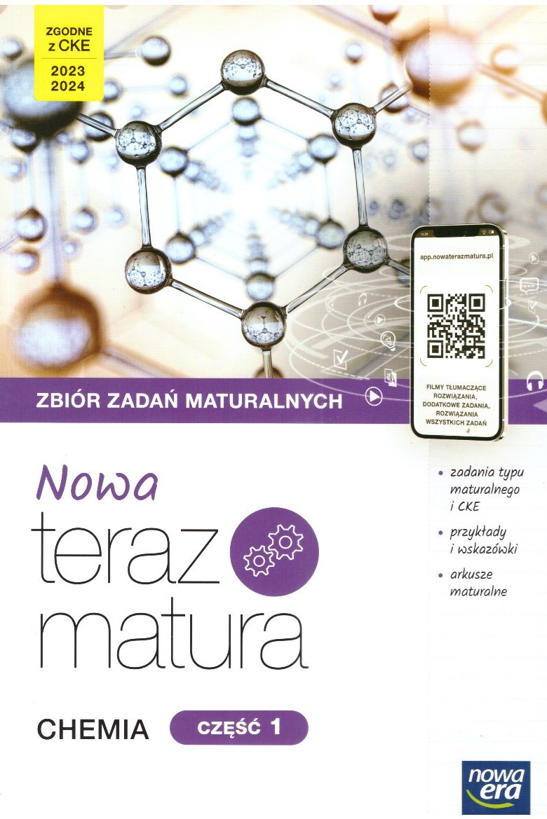 Zbiór zadań maturalnych "NOWA Teraz matura. Chemia. Część 1. i 2." pozwala wyćwiczyć umiejętności niezbędne podczas rozwiązywania zadań typu maturalnego oraz pracę z arkuszem. Jest w pełni skorelowany z Vademecum "NOWA Teraz matura. Chemia" i zawiera kody dostępu do dodatkowych materiałów na portalu nowa.terazmatura.pl. Realizuje wymagania egzaminacyjne CKE obowiązujące na maturze w latach 2023 i 2024. Zadania typu maturalnego ze wskazówkami i zadania CKE, uporządkowane w działach i przekrojowe, przykłady - tłumaczące krok po kroku rozwiązania zadań problemowych i obliczeniowych, jest na to sposób - pomoc w opanowaniu najważniejszych umiejętności i zapamiętaniu pojęć, arkusze maturalne dodatkowe materiały, m.in.: filmy tłumaczące rozwiązania, dodatkowe zestawy zadań do każdego działu i arkusze maturalne, oraz rozwiązania wszystkich zadań dostępne na portalu nowa.terazmatura.pl