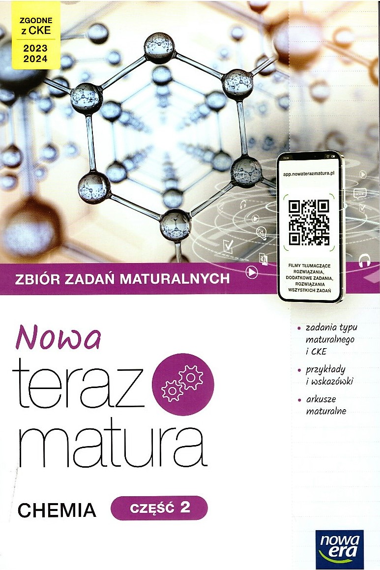 Zbiór zadań maturalnych "NOWA Teraz matura. Chemia. Część 1. i 2." pozwala wyćwiczyć umiejętności niezbędne podczas rozwiązywania zadań typu maturalnego oraz pracę z arkuszem. Jest w pełni skorelowany z Vademecum "NOWA Teraz matura. Chemia" i zawiera kody dostępu do dodatkowych materiałów na portalu nowa.terazmatura.pl. Realizuje wymagania egzaminacyjne CKE obowiązujące na maturze w latach 2023 i 2024. Zadania typu maturalnego ze wskazówkami i zadania CKE, uporządkowane w działach i przekrojowe, przykłady - tłumaczące krok po kroku rozwiązania zadań problemowych i obliczeniowych, jest na to sposób - pomoc w opanowaniu najważniejszych umiejętności i zapamiętaniu pojęć, arkusze maturalne dodatkowe materiały, m.in.: filmy tłumaczące rozwiązania, dodatkowe zestawy zadań do każdego działu i arkusze maturalne, oraz rozwiązania wszystkich zadań dostępne na portalu nowa.terazmatura.pl