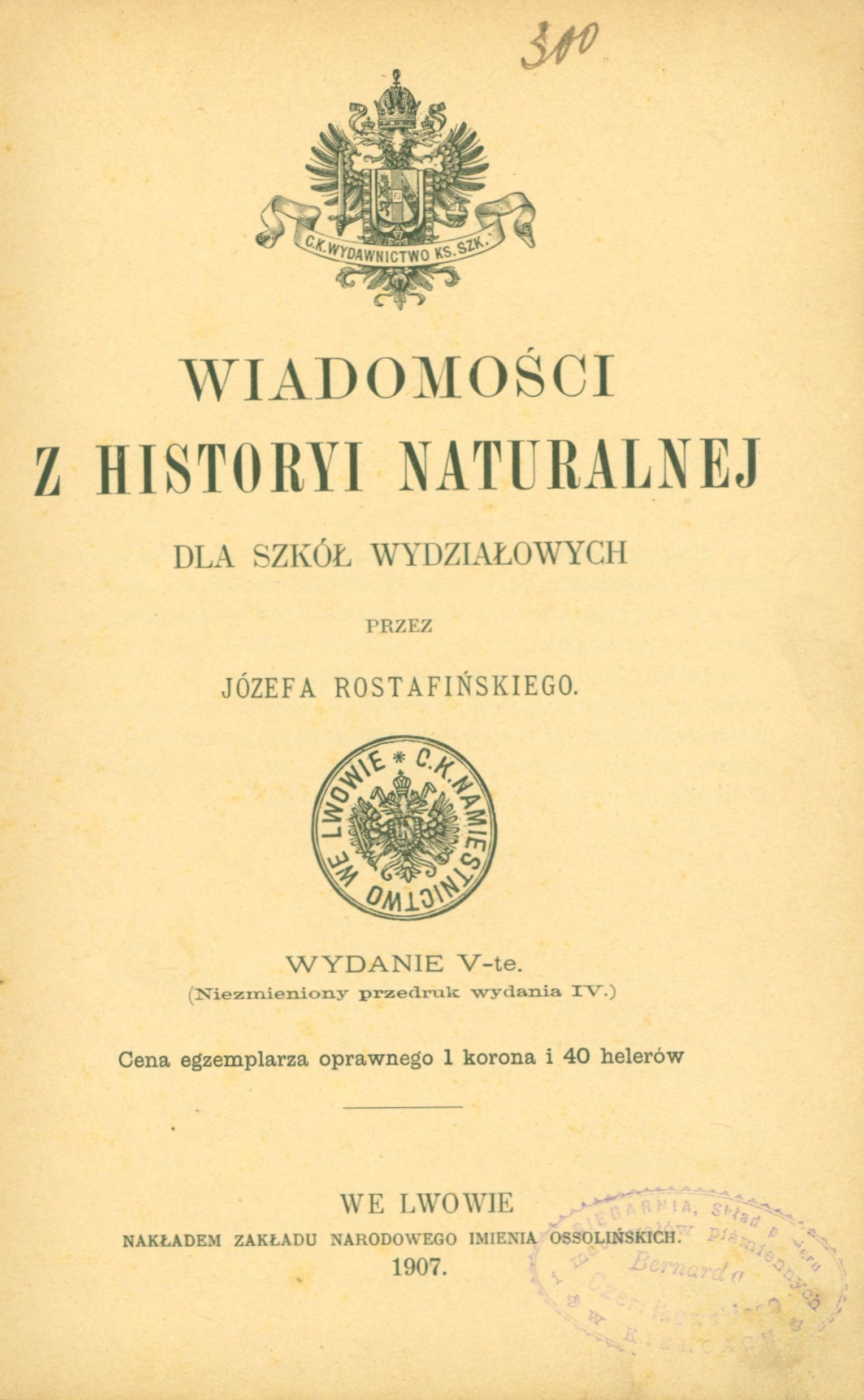 Na stronie tytułowej pieczęć: C. K. Namiestnictwo we Lwowie, u góry strony tytułowej: C. K. Wydawnictwo Ks. Szk.